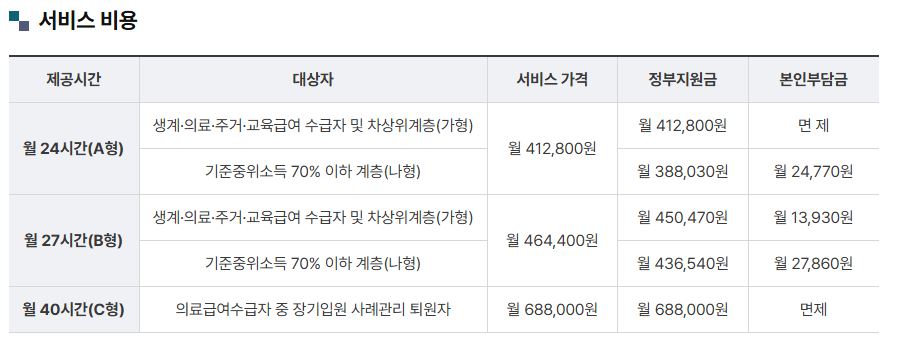 간호간병 서비스는 제공시간에 따라 월 24시간, 월 27시간, 월 40시간으로 나뉩니다. 각 시간별로 대상자와 가격이 조금씩 다르며 정부지원금과 본인부담금도 다르므로 신청 전 확인해야합니다. 본인부담금은 대체로 면제이며 부담하는 가격은 대상자마다 조금씩 차이가 있으며 월 1-2만원 정도입니다.