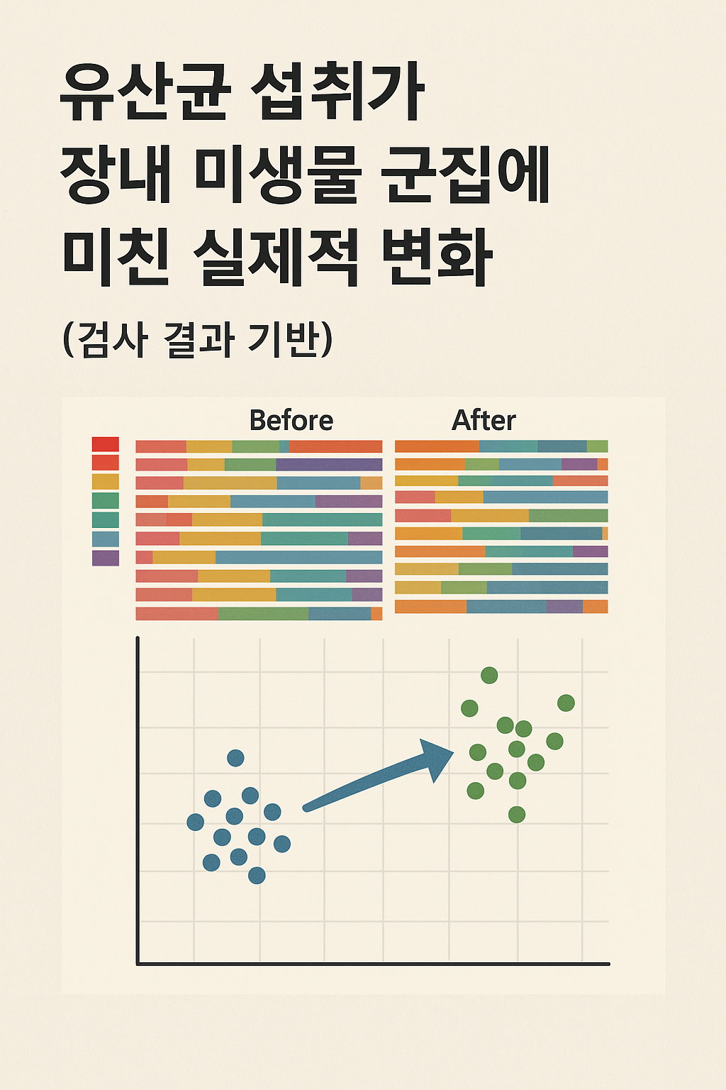 유산균 제품(Lactobacillus acidophilus와 Bifidobacterium bifidum 등 포함)을 3개월간 매일 섭취하며, 전문 검사기관에서 장내 미생물 군집 분석(16S rRNA 시퀀싱)을 실시했습니다. 이 검사는 장내 미생물의 구성을 정확히 파악할 수 있는 최신 분자생물학적 방법입니다.